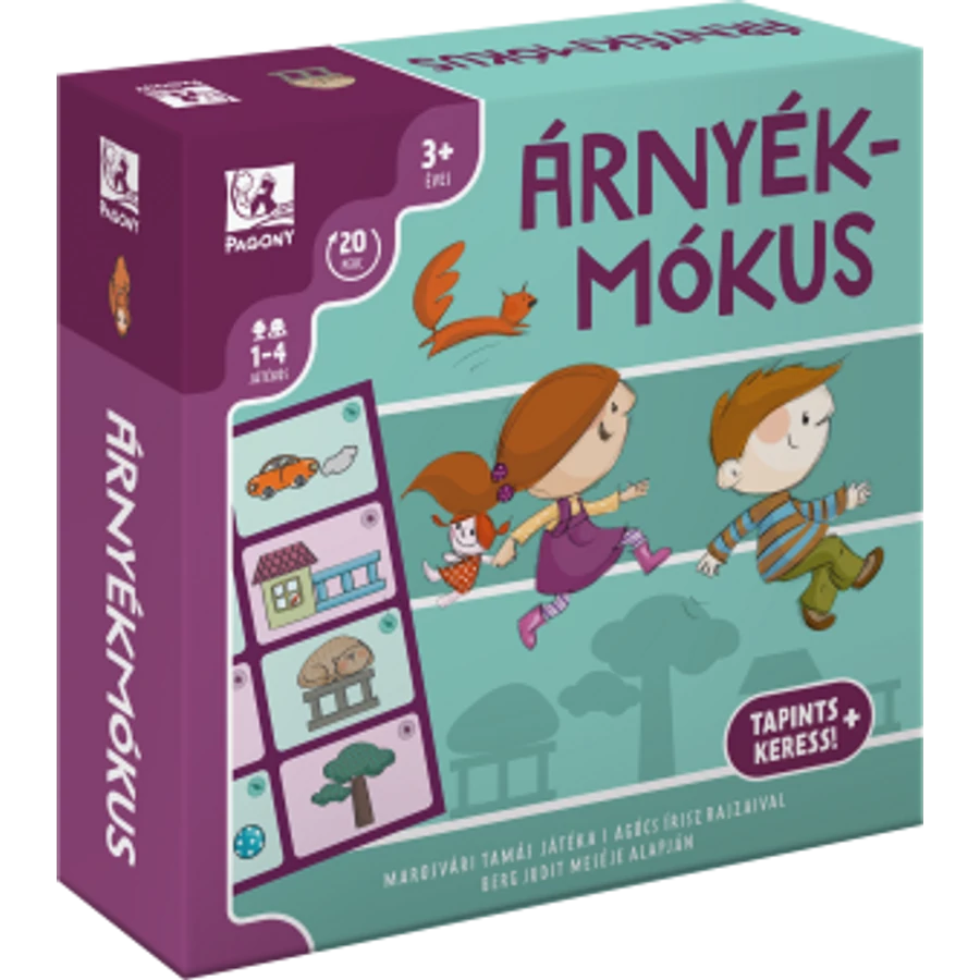 Forma kitapintós társasjáték. A dobozban négy játékváltozat található különböző korú gyerekeknek, együttműködő és versengő módban is. Sári és barátai nagyot kirándultak, és hazafelé szörnyen elfáradtak. Milyen jó lenne most mókusnak lenni és hipp-hopp hazaugrálni! Hogy gyorsabban teljen az idő, a fák és kerítések árnyékain szökdécselnek haza. Segíts nekik megtalálni a megfelelő árnyékokat, amiken hazajuthatnak! Ehhez nem kell mást tenned, csak ügyesen kitapogatni a megfelelő formákat a vászonzsákban, és kirakni belőlük a kártyádon látható rajzot. Figyeld meg a képeket! Milyen formákat látsz rajtuk? Tapintsd ki a zsákban a megfelelő alakú lapkákat! Rakd össze a képek árnyékát! Lépkedj végig a bábuddal a felépített árnyékokon, és érj haza elsőként!
