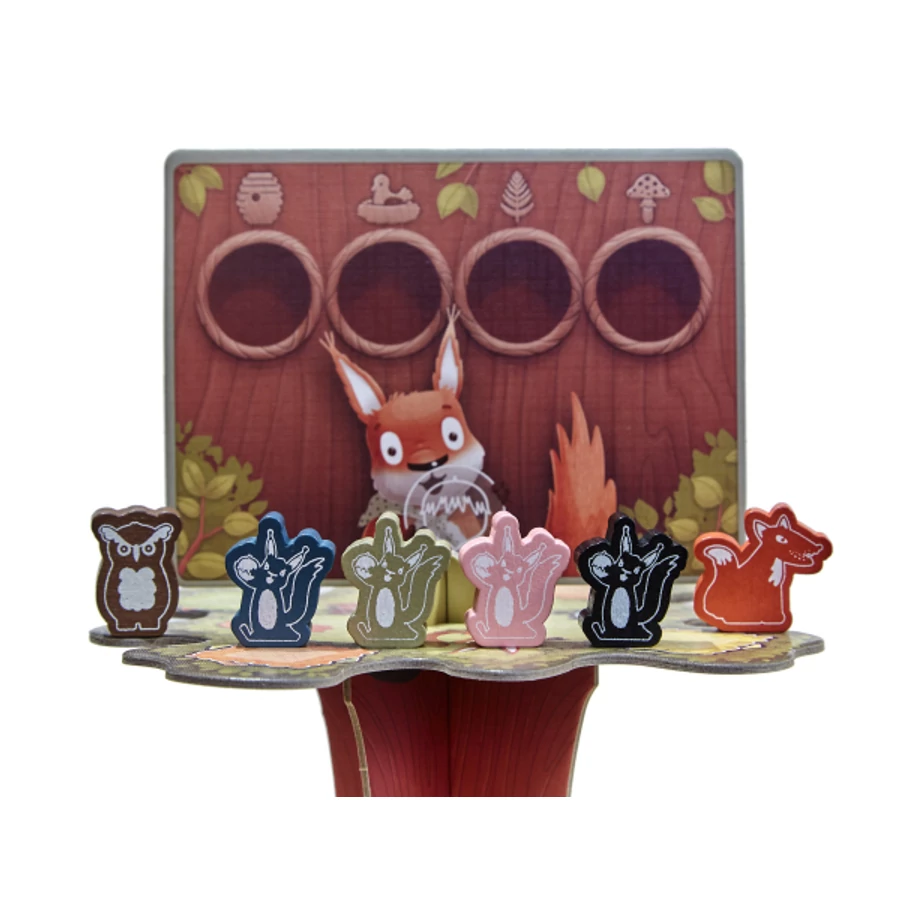 A doboz tartalma: 1 összeépíthető fa 1 bagoly figura 1 róka figura 4 mókus figura 4 játékostábla 4 színkocka, amivel a mókusokat tudjátok léptetni 1 nyolcoldalú kocka a róka és a bagoly mozgatásához 18 mogyorókorong