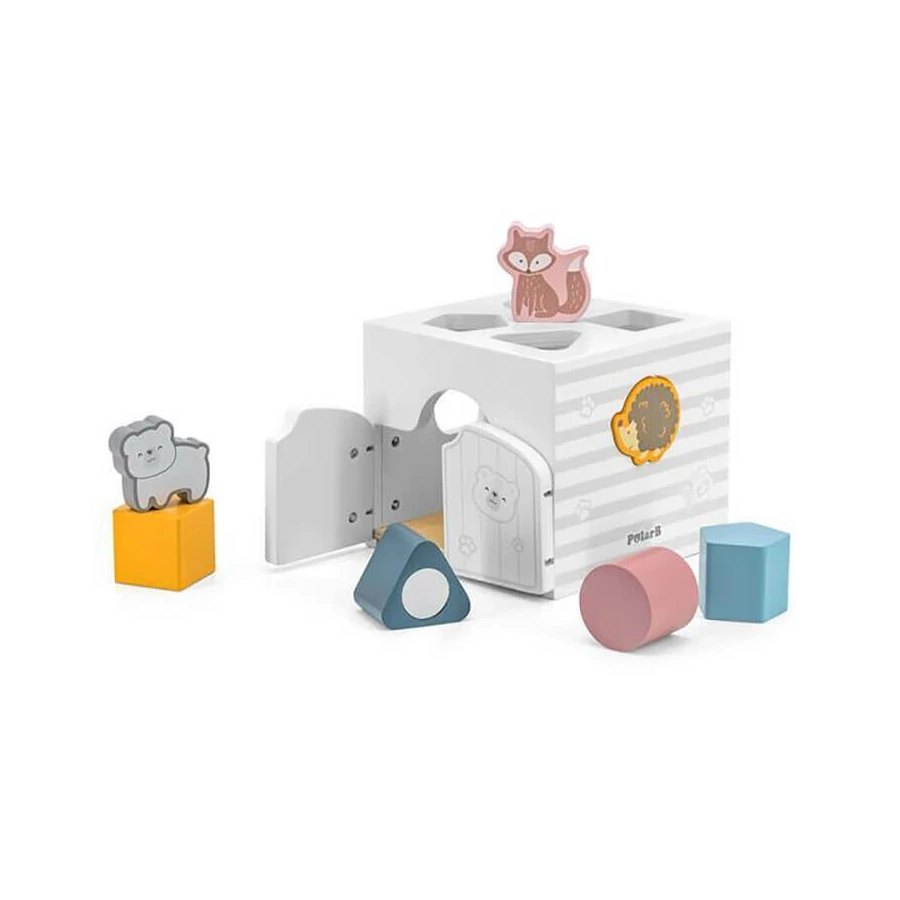 Fából készült formabedobó állatokkal és geometriai elemekkel. Szórakoztatja és hosszú időre leköti a gyermekeket, emellett fejleszti is őket. Rázogatásra a formák zörögnek, amely még érdekesebbé teszi a vele töltött időt. A játék során fejlődik a gyermekek finommotoros készsége, szem-kéz koordinációja és térlátása. Segít még a színek, formák és állatok elnevezésének megismerésében és gyakorlásában játékos módon.