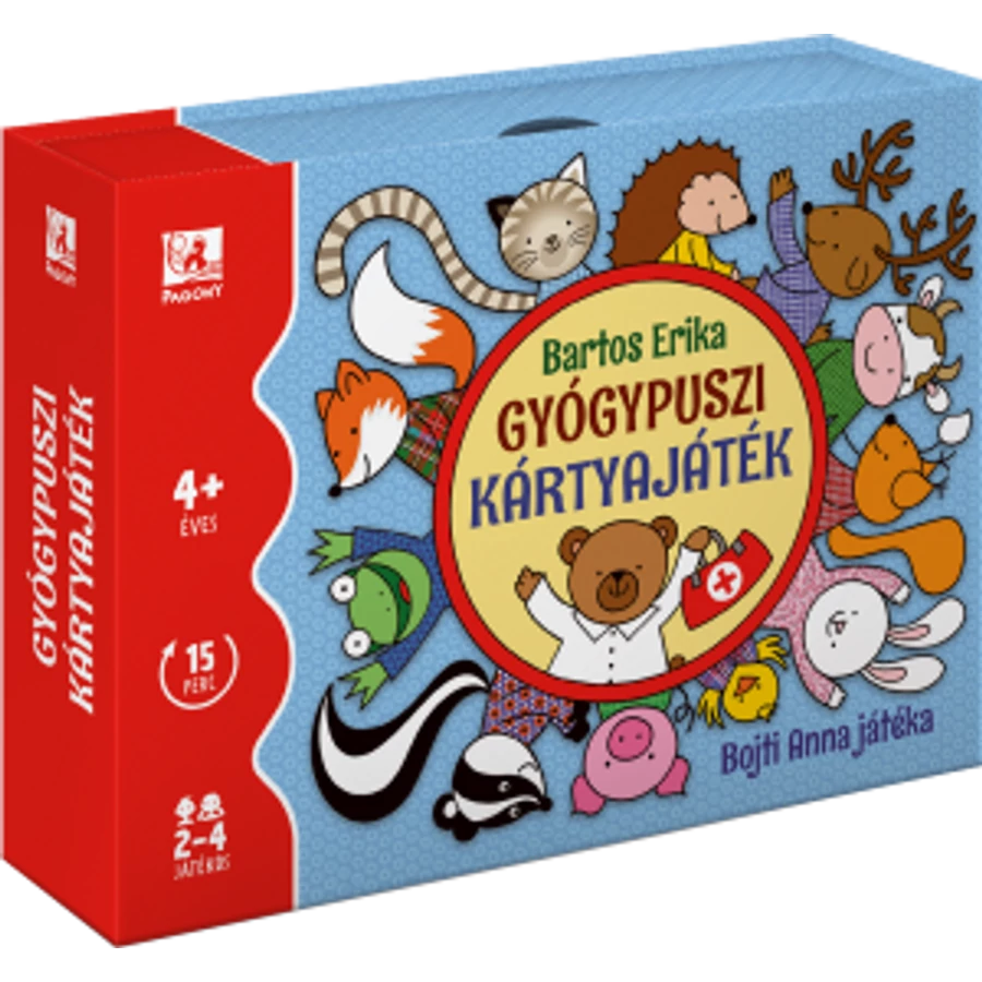 Ajjaj! Megfájdult Béka torka! Náthás lett Mókuska, elesett Egérke. Siess, segíts a kis állatoknak, gyógyítsd meg őket! Nem kell mást tenned, csak dobnod a színkockákkal, és egy kis szerencsével és ügyességgel mindenki meg fog gyógyulni. Ha pedig nagy a baj, Brummbrumm doktor jön, és segít. Egyszerű és izgalmas játék Bartos Erika népszerű sorozatához – két játékverzióval: kicsiknek és nagyobbaknak. Játékelemek: 44 kártya 11 lapka 3 dobókocka 4 lázmérő jelölővel 1 maci kezdőjátékos-jelölő 1 játékszabály 1 „Ki hogyan gyógyul?” füzet