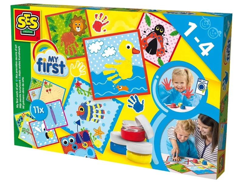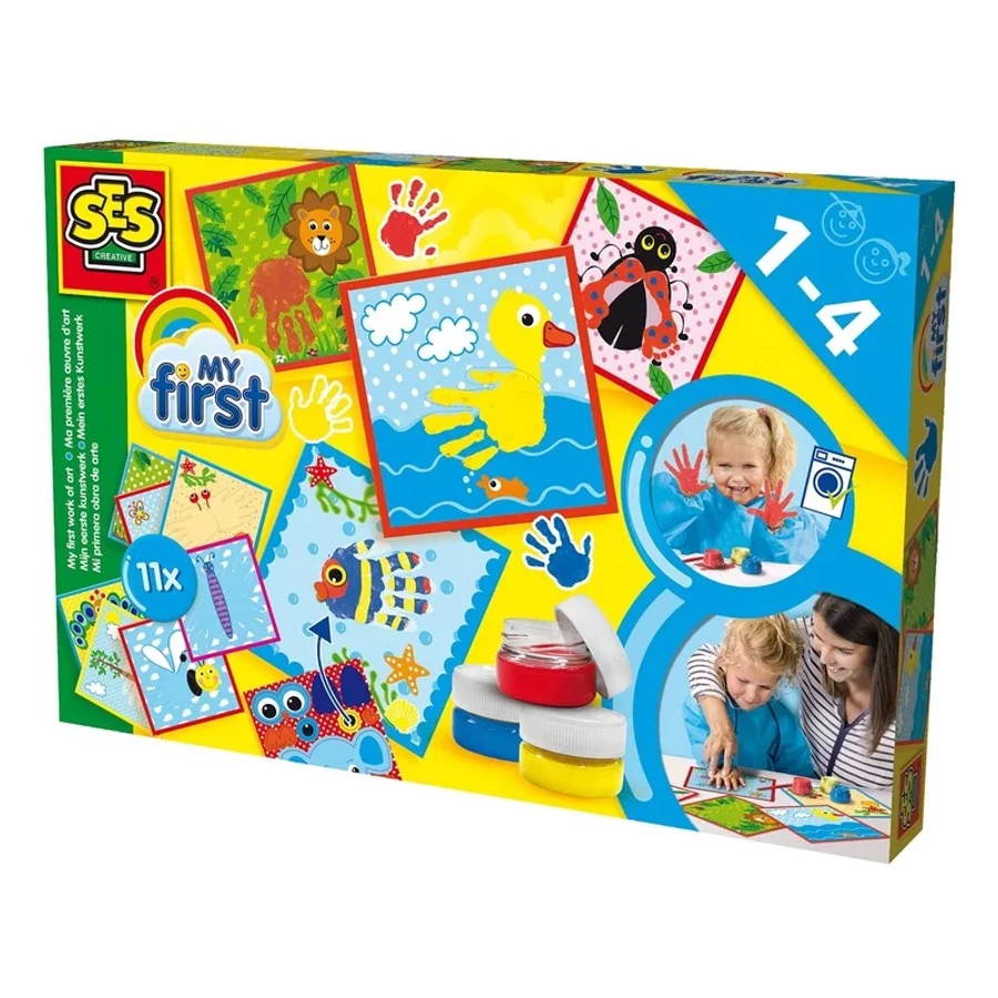 Fess gyönyörű képeket a kezeid segítségével! A SES Első műalkotásom 11 darabos készlet a legkisebbek számára készült képalkotó játék, ahol a kezüket és lábukat is használhatják! A képeknél az üresen hagyott helyekre kell a festékbe mártott kezeket vagy talpakat tenni, hogy elkészülhessenek a képek, a kacsa testét pl. egy tenyérlenyomat adja, a katicabogár szárnyait pedig két talp. A SES Első műalkotásom 11 darabos készlet ujjfestéket és a sablonokat is magában foglalja. Csomagolás méretei: 20 x 4 x 30 cm.