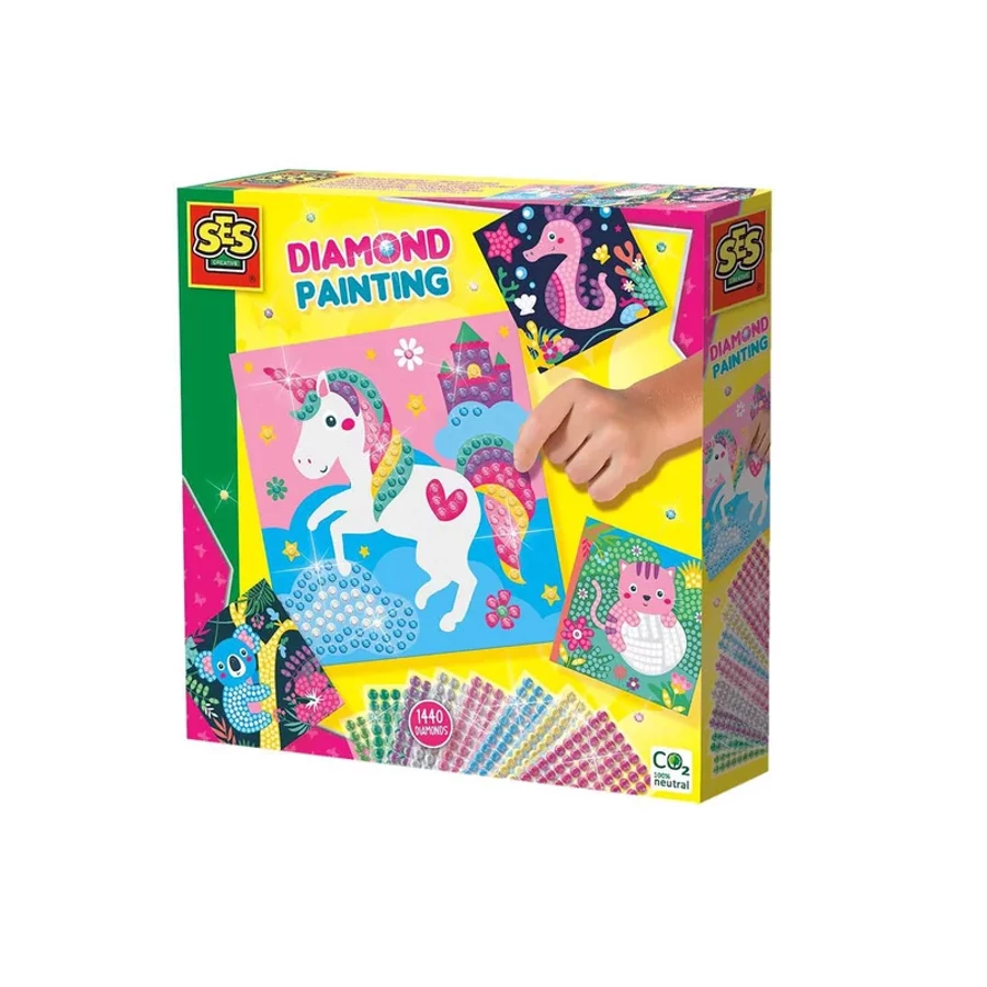Gyémántfestő készlet extra nagyszámú gyémántkővel mely órákon át szórakoztatja a gyerekeket. A fényes gyémánt strasszok öntapadósak, így nagyon könnyen rögzíthetők ezekre a vidám kártyákra. Díszíts egy egyszarvút, egy macskát, egy koalát és egy csikóhalat. A SES Creative egy holland oktató és kreatív játékok gyártója, amelyek motoros készségeket, szellemet, kreativitást és képzelőerőt fejlesztenek. A csomag tartalma: 1440 db kő 8 színben, 4 db képes kártya